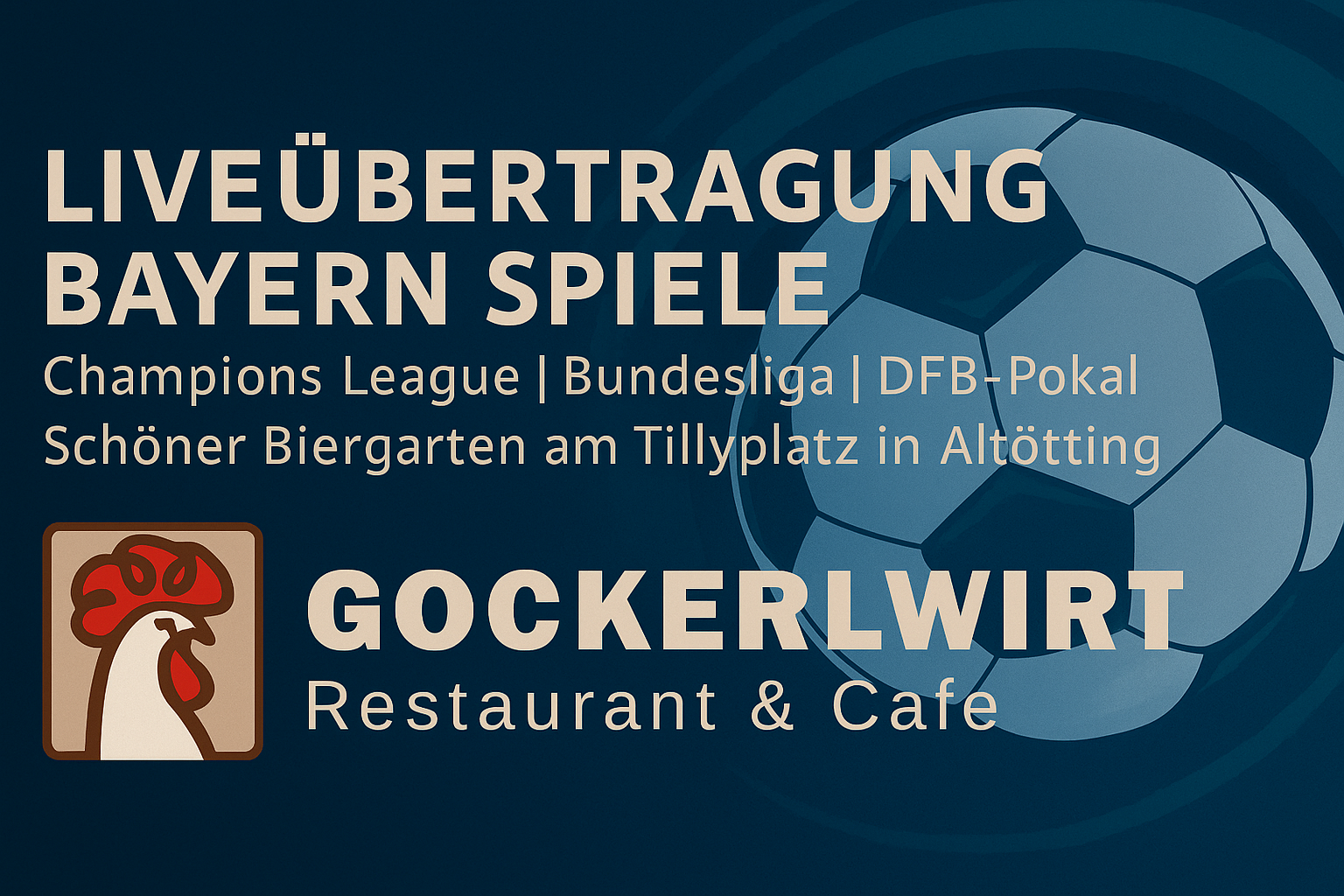 Beim Gockerlwirt kimmt z’samm, wos z’sammghört: de Leidenschaft fürs Spui und a gscheide boarische Gastfreundschaft – des is genau des Richtige, wenn Champions League oder Bundesliga übern Fenseh laffa. Kimm vorbei, wenn’s hoaßt: Spannung, Gfüh und Toooore – do samma Fans, Geniessa und olle beinand, de Fußball leb’n.