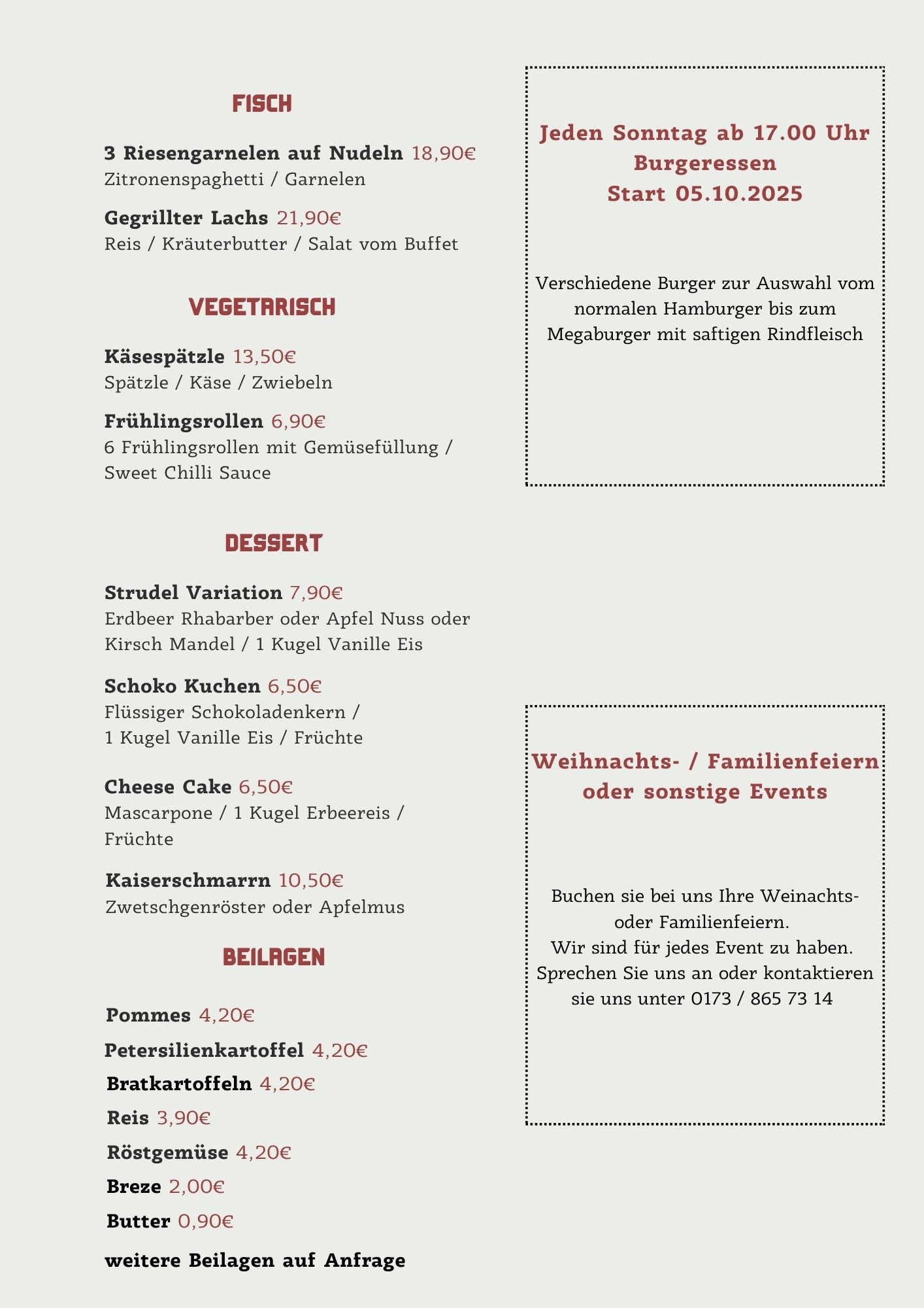 Auch Freunde von Fisch und leichten Gerichten kommen bei uns auf ihre Kosten – etwa mit gegrilltem Lachs auf Reis und Kräuterbutter oder den feinen Riesengarnelen auf Zitronenspaghetti. Vegetarier schätzen unsere hausgemachten Käsespätzle oder den frischen Tomaten-Avocado-Salat.