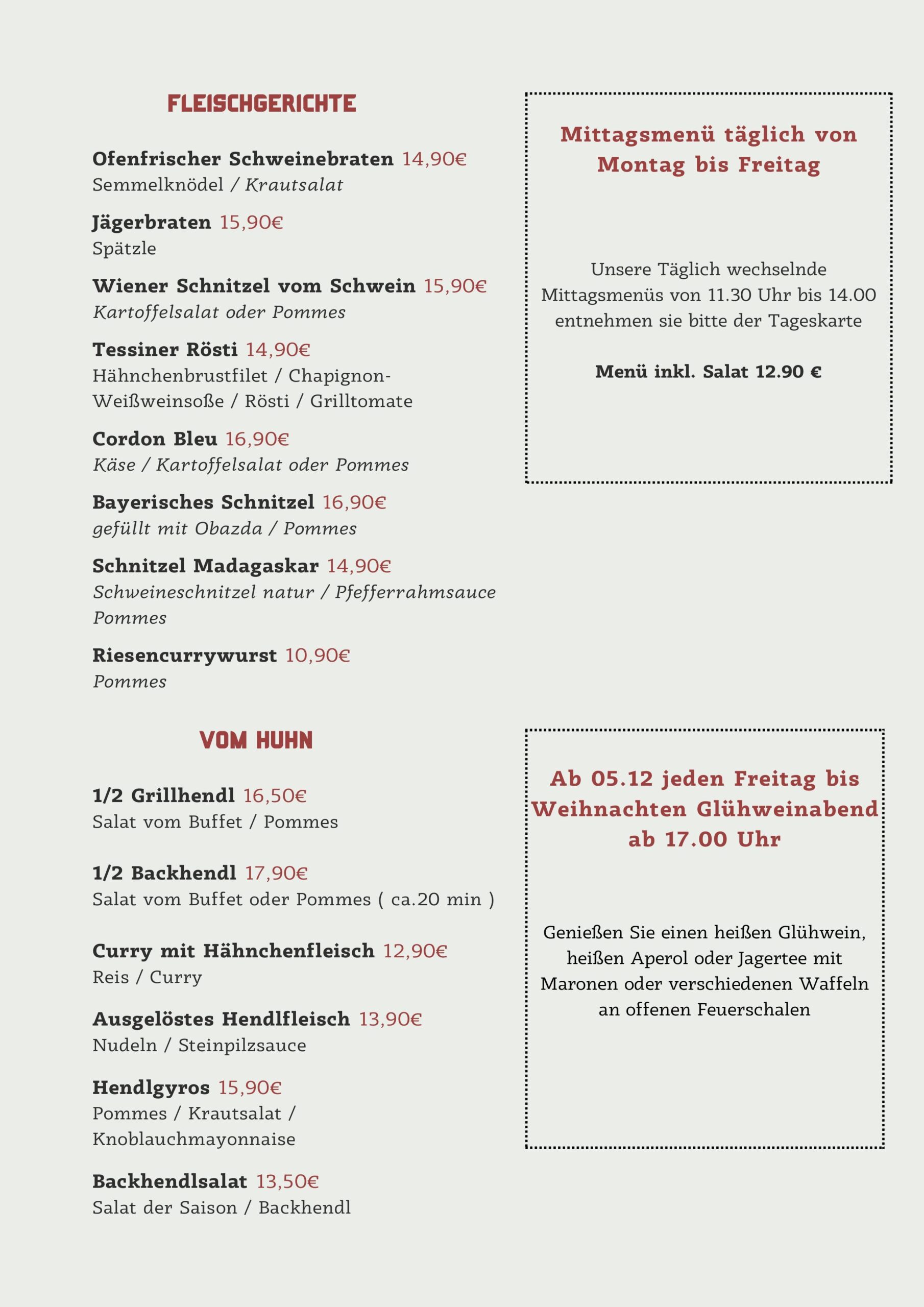 Ob eine kräftige Hühnerbouillon mit Leberknödel, ein ofenfrischer Schweinebraten mit Knödel und Krautsalat oder ein krosses ½ Grillhendl – hier schmeckt man die echte bayerische Wirtshausküche. Unsere Schnitzelvariationen von klassisch bis raffiniert gefüllt mit Obazda sind ein Genuss für alle, die Hausmannskost mit dem gewissen Etwas lieben.