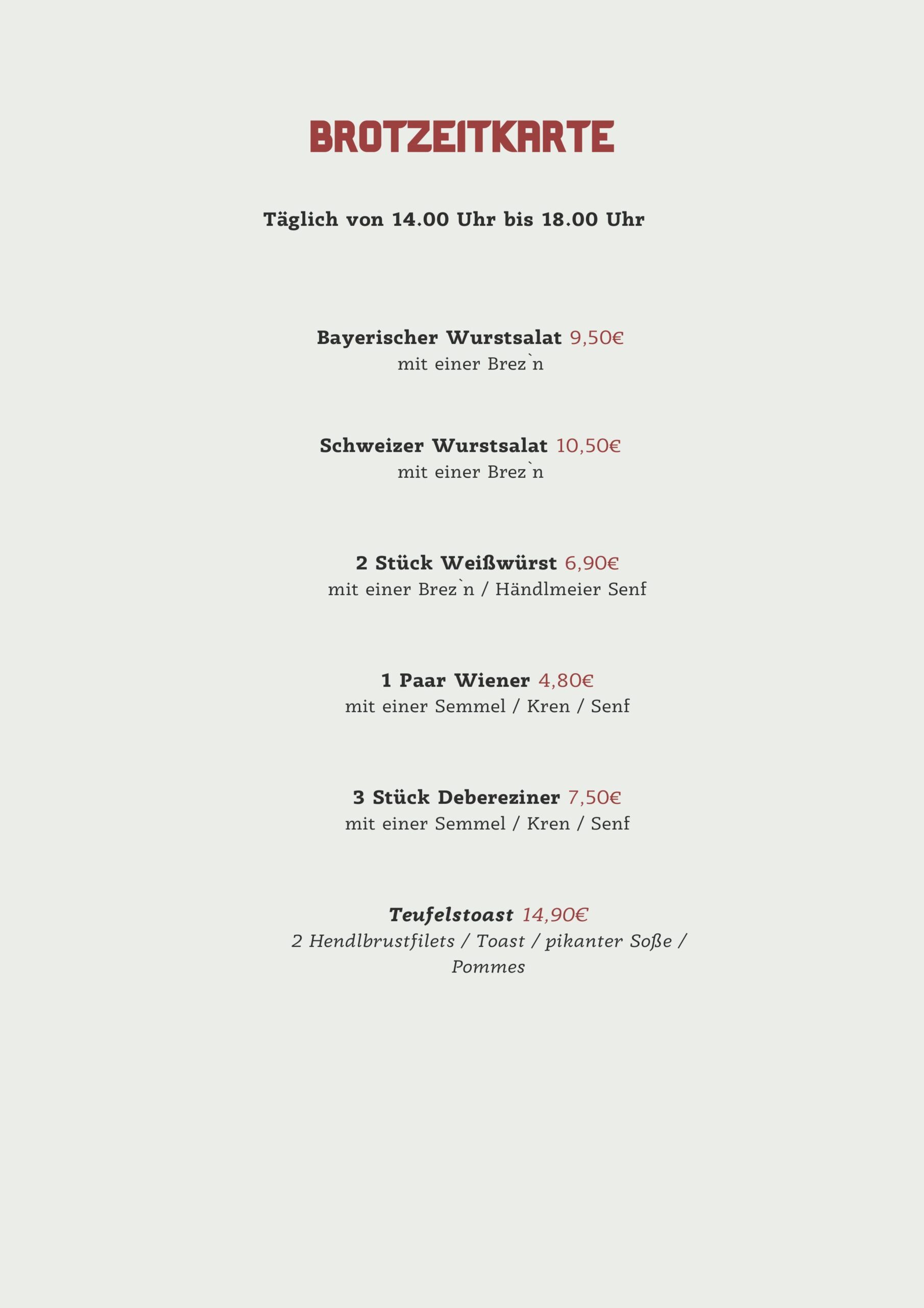 Natürlich darf in einem bayerischen Wirtshaus die Brotzeitkarte nicht fehlen: vom deftigen Wurstsalat mit Breze über klassische Weißwürste mit Händlmeier-Senf bis hin zum pikanten Teufelstoast – ideal für gesellige Stunden am Nachmittag.